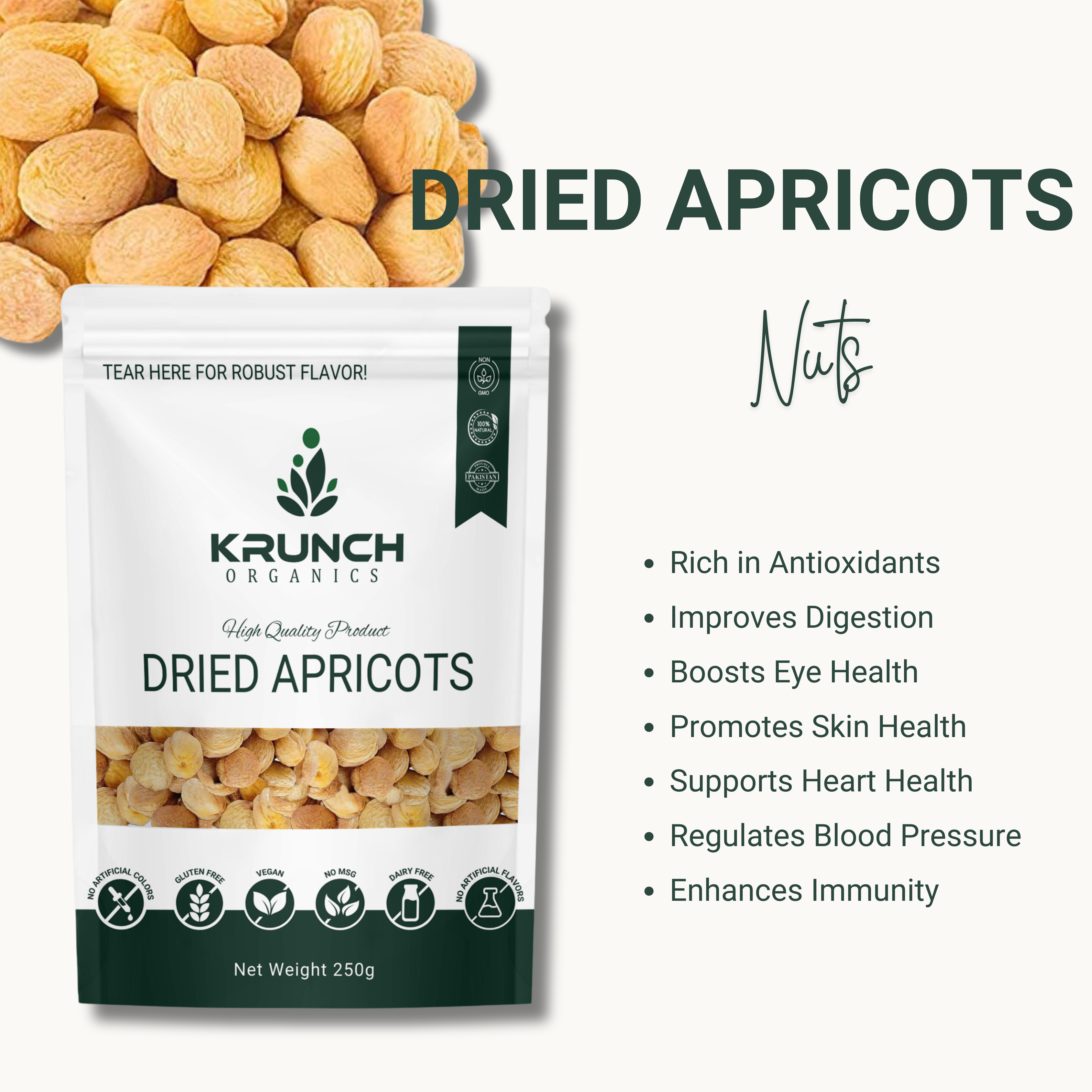 Select the pouch size that fits your routine and enjoy a nutrient-rich, naturally sweet snack backed by Krunch Organics quality. Whether for daily snacking or culinary use, dried apricots add reliable flavor and nutrition to your pantry.